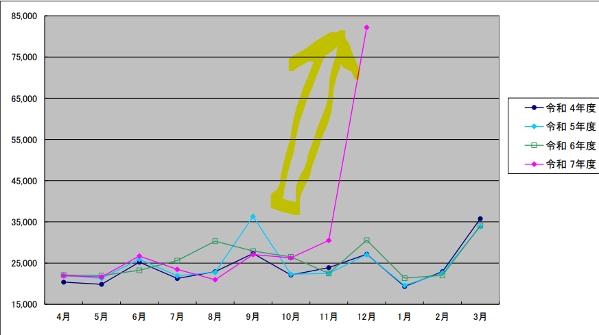 以前に4回シリーズで、特許庁の統計速報(過去3年分を含む月ごとの出願件数)で上のグラフと同様の出願の異常値、急増(+1万件)をお伝えした。(日本特許庁には年間約30万件の出願があるので、約3%増にあたる。)。 この時の、2023年9月の急増(上のグラフで水色線の9月)は、その出願の公開公報が2025年1月から4月にかけて大量に発行され、急増の出願はソフトバンクグループによることが判明した。出願急増の数月前に孫社長兼会長が1万件出願を発表・宣言していたので、ソフトバンクではないかとの予測は当たっていた。しかし、今回はそのような明示的なニュースないので、出願人がどの企業かは予想がつかない。 上のグラフが示す昨年2025年12月の出願激増(+約5万件)の仕掛け人(出願人)は、公開公報が発行される2027年6月頃まで謎である。 2つ目の謎は、大量に出願明細書を作成する方法である。5万件は、日本の大手特許事務所約10社の年間出願能力を合わせた能力が必要だ。現実は、日本の弁理士数は最近は横ばい傾向にある。 3つ目の謎は、12月にまとめて約5万件出願する意図である。特許事務所は出願準備ができた発明を順に、年間通して出願するのが一般的である。 なお、私は日経BP社からこの急増についての取材に協力しました。その記事も併せて読んでください。他の専門家が、多角的にこの現象について分析、推察しておられます。